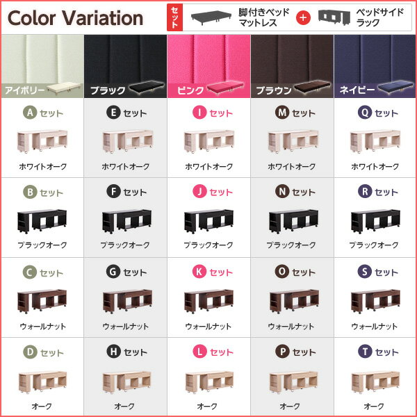 【商品について】脚付きマットレスベッド【-Ilene-イレーヌ】(伸縮式ベッドサイドラックセット)(ポケットコイル・シングル用)■サイズ:外寸:(ベッド)シングル:(約)幅97x長さ194x高さ31cm(脚の長さ:15cm含む)(約)29.5kg(ラック)外寸:(約)幅100〜178x奥29.2x高44.5cm(約)13kg■カラー:(ベッド)ブラック アイボリー ブラウン ピンク ネイビー(ラック)ウォールナット オーク ホワイトオーク ブラックオーク■素材:(ベッド)貼り材:ポリエステル クッション材:ポケットコイル、ウレタンフォーム、フェルト、不織布 脚:木製脚15cm(ラック)材質:パーチクルボード、MDF 表面材:プリント紙化粧合板■その他:・お客様組立商品です・梱包サイズ:(約)幅97x長さ104x高さ32cm(約)30.5kg(ラック)(約)108x32.5x12cm(約)14.75kg